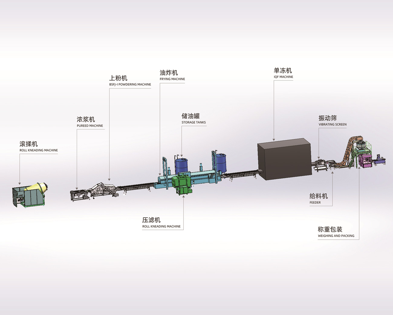 滾揉機(jī)、上漿機(jī)、上粉機(jī)、連續(xù)式油炸機(jī)、壓力式濾油機(jī)配稱重、包裝、檢重設(shè)備,適用于各類熟食、調(diào)理品企業(yè)。